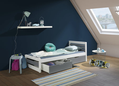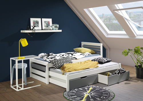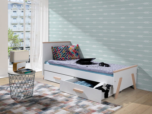 Pat din lemn de pin si pal, cu 2 sertare pentru copii, Caren Alb / Natural, 200 x 90 cm