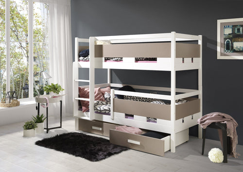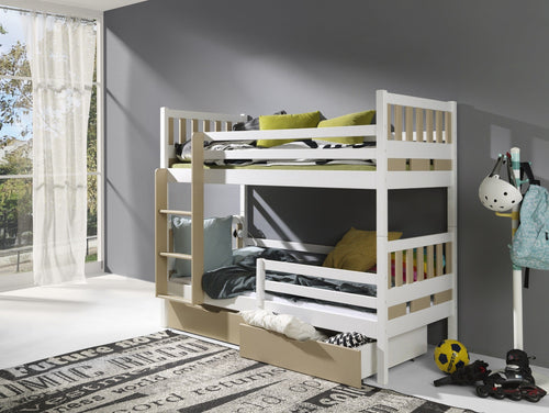 Pat supraetajat din lemn de pin, cu 2 sertare pentru copii Beniamin Alb, 200 x 120 / 200 x 90 cm