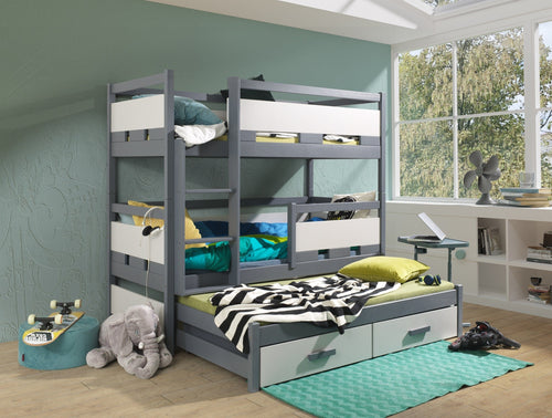 Pat supraetajat din lemn de pin, cu 2 sertare si 3 locuri, pentru copii Karim III, 200 x 90 cm