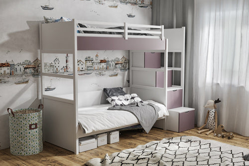 Pat supraetajat din lemn de pin si pal, cu 2 sertare si 3 locuri, pentru copii Ruben III, 200 x 90 cm