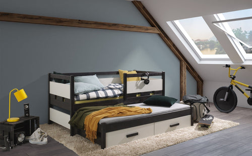 Pat din lemn de pin cu 2 sertare, pentru copii Kama, 200 x 90 cm