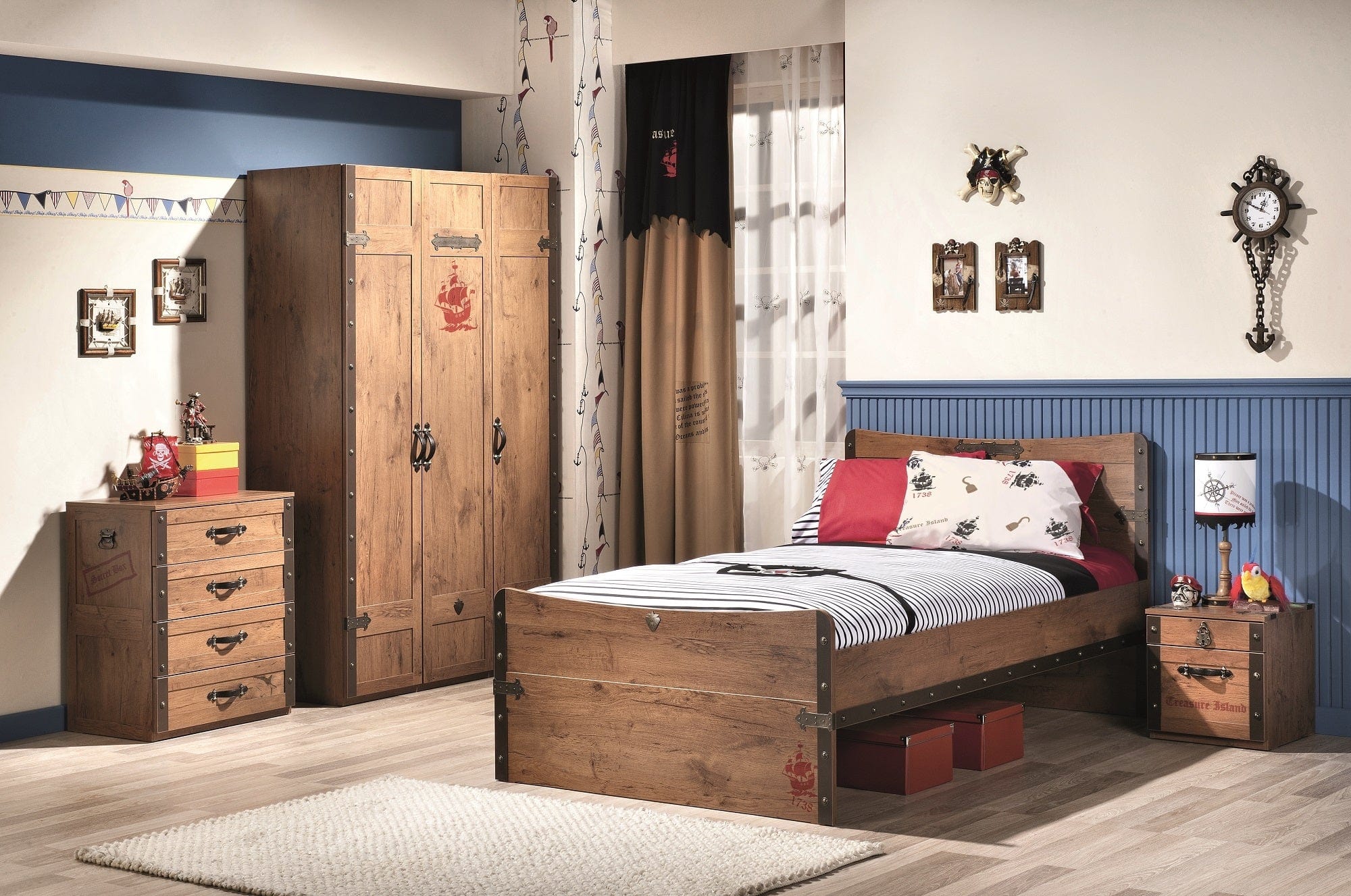 Colectia Pirate se caracterizeaza prin finisaje spectaculoase si design unic. Inca de cand sunt mici, baieti isi doresc sa porneasca intr-o expeditie precum personajele lor preferate din povestile cu pirati. Poti face posibil acest lucru amenajand camera, astfel ca ei sa se simta intr-o continua aventura.