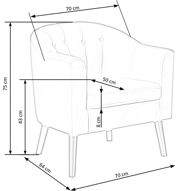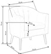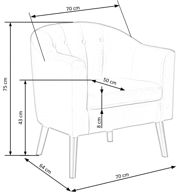 Fotoliul este tapitat cu stofa si are picioarele realizate din lemn de cauciuc.