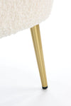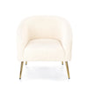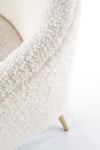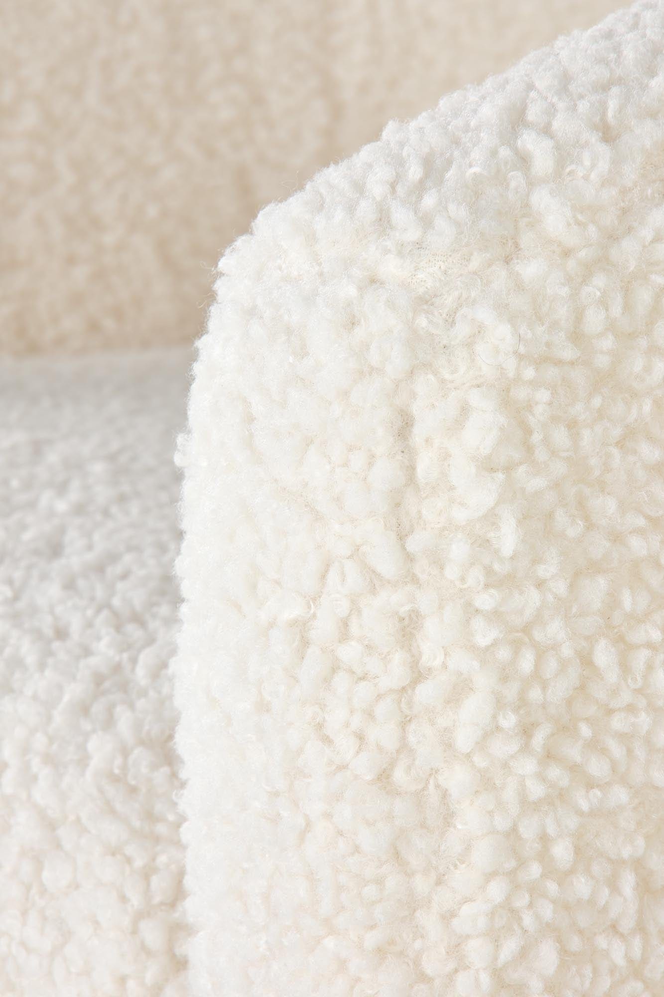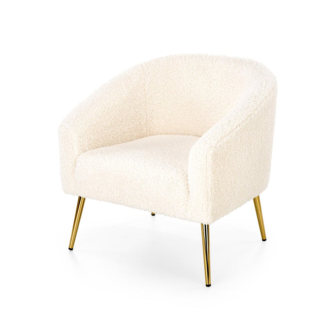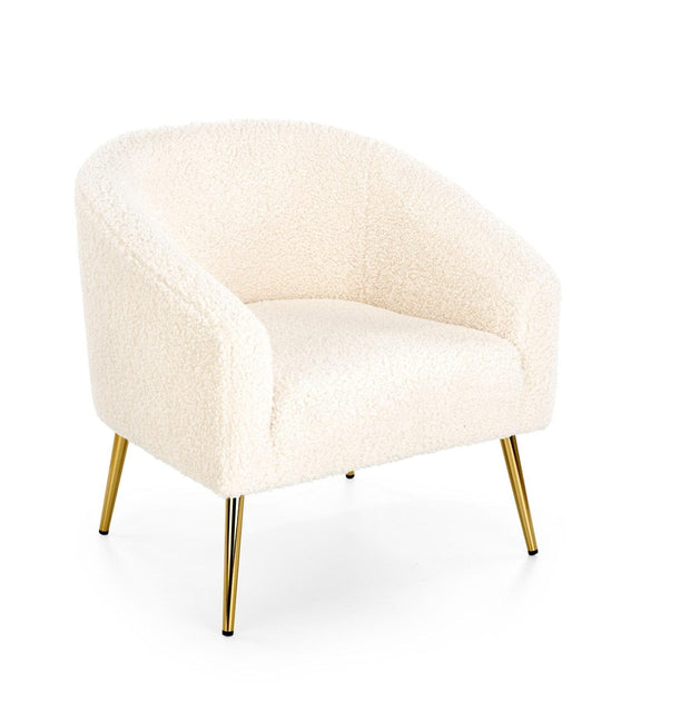 Fotoliul este tapitat cu stofa boucle si are picioarele din metal.