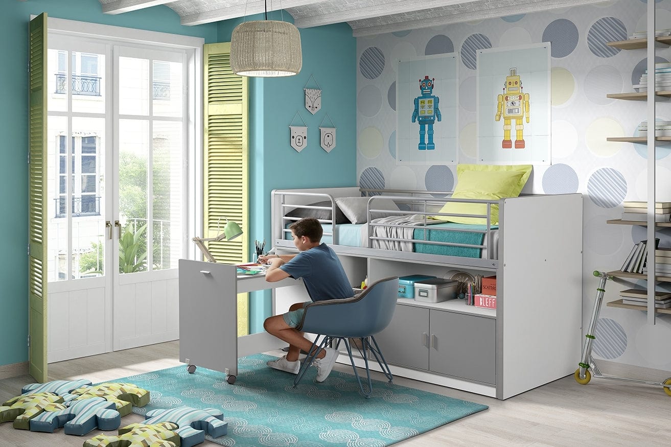 Patul dispune de masa de birou incorporata, 2 usi si rafturi pentru depozitare.