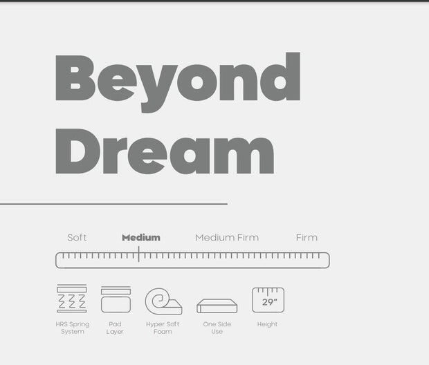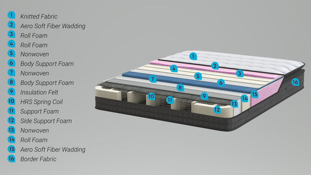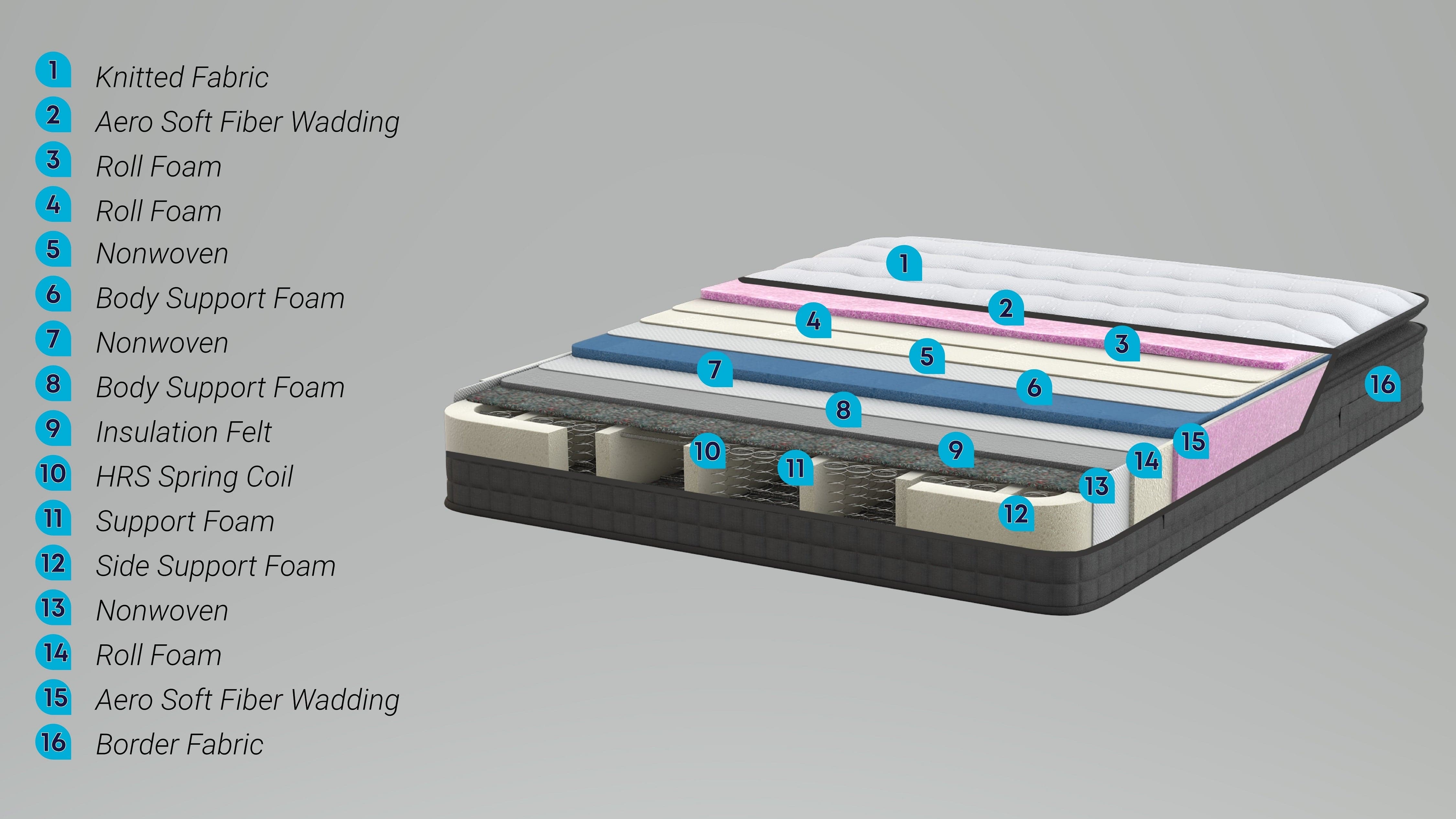 HRS(high resistant spring system) este un sistem de arcuri mai rezistent decat cele clasice. Cu 6 spirale din care este format un arc, aceasta saltea isi mentine forma in timp indelingat si ofera o rezistenta sporita sustinerii greutatii. Este diferita de celelalte datorita numarului mai mare de arcuri pe aceeasi suprafata. Stratul de spuma Hyper de inalta calitate uniformizeaza suprafata de contact si ofera o senzatie de confort maxim pentru un somn de calitate. Stratul de fibre Aero Soft ajuta la mentinera caldurii ideale in timpul somnului si permite ventilatia aerului oferind o senzatie de confort maxim pentru un somn de calitate. Topperul este realizat din spuma Hyper si puf de gasca cu grosime de 10,9 cm. Salteaua se poate utiliza doar pe o parte.